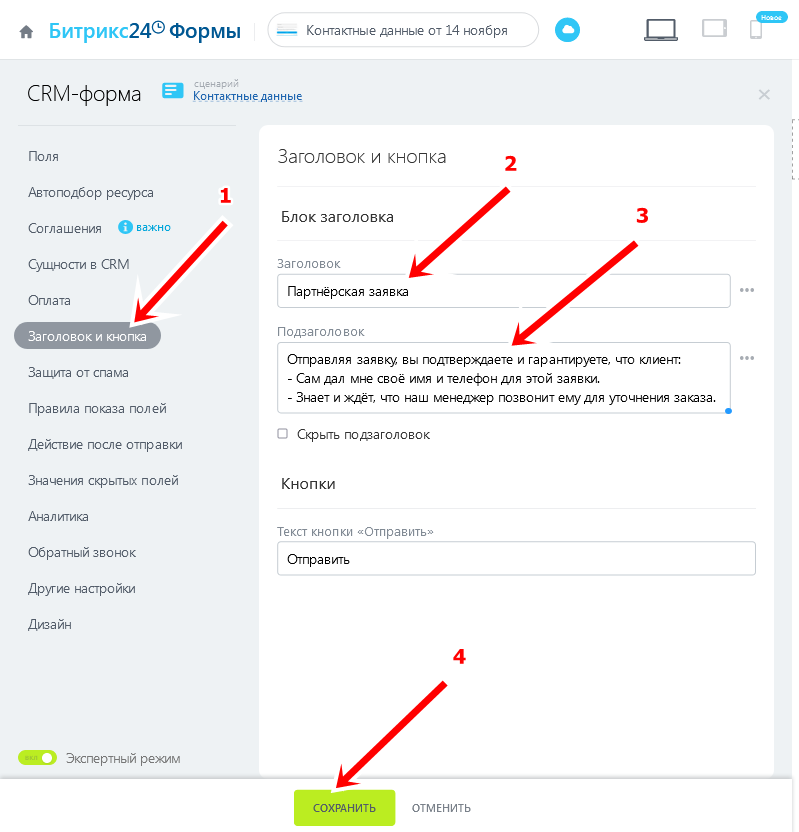 CRM → Продажи → Каналы продаж(2) → CRM-формы(3) и нажмите кнопку Добавить(4):