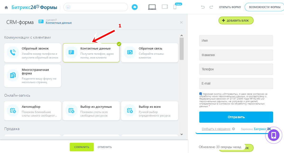2 Нажмите на шаблон Контактные данные(1):