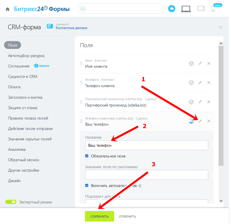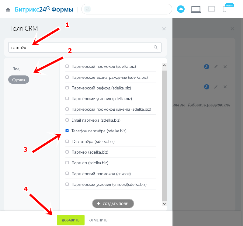 Телефон партнёра (sdelka.biz) → Ваш телефон (нужно отметить обязательным)