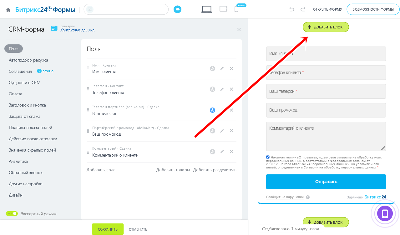 Далее нужно добавить поля, которые вы хотите чтобы партнёр заполнил, передавая вам информацию о клиенте.